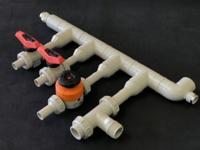 ※奥手に写っているグレーの加工品は、PVC製たわみ継手です。